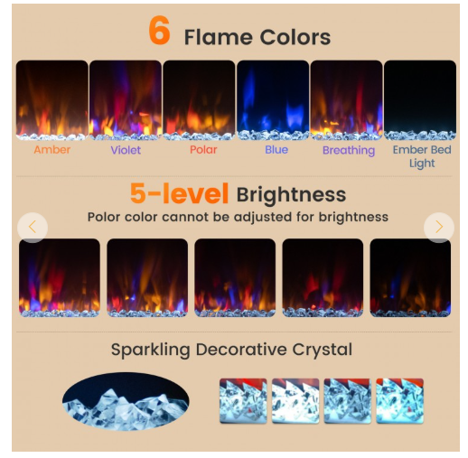● Visual Enjoyment: With 6 flame options (amber/violet/blue/polar/breathing/sleep) and 5 brightness levels, this electric fireplace brings you an unparalleled visual experience. Besides, the flame function can be used alone, transforming this heater into a year-round decoration.